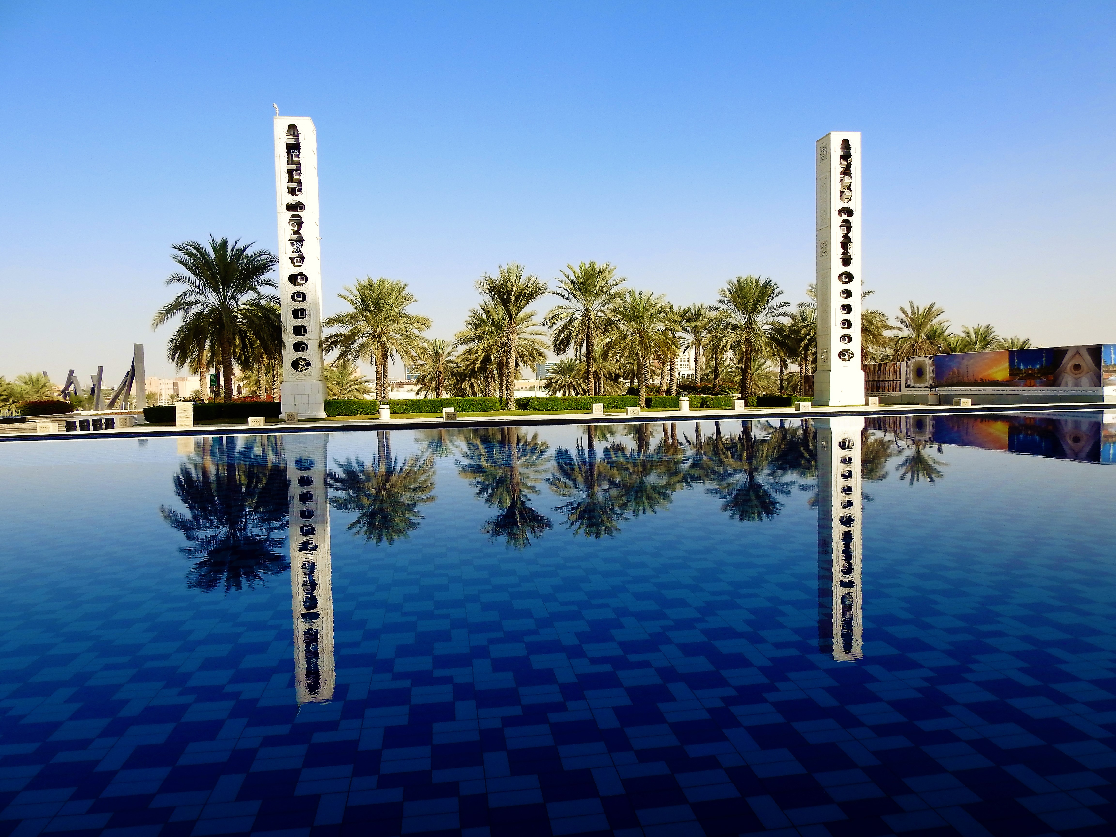 We went out to the cultural village, obviously newly constructed for tourists to walk round, and looked across the water to the city. It was beautiful. The palm trees and sand. A group of school-kids came down to play in the water – all dressed up in their headscarves and long clothes. It looked a bit absurd but they were kids and enjoyed the paddle, shrieking with delight.